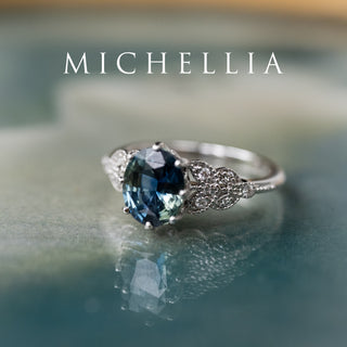 Main stone details: Natural Teal Blue/Green Parti Sapphire, 1.80ct