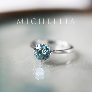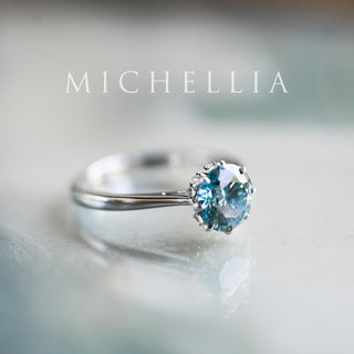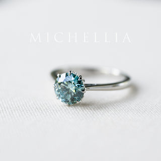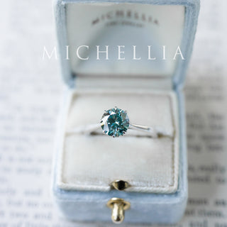Our iconic Victoria setting meets the allure of the sea in this unforgettable solitaire ring. A rare teal blue diamond shimmers with the tranquil depths of hidden lagoons, its color evoking mermaid legends and sunlit waves. Cradled in the Victoria’s iconic royal-inspired crown basket, dusted with delicate diamond accents, this OOAK beauty feels at once timeless and otherworldly—a treasure worthy of a modern siren.