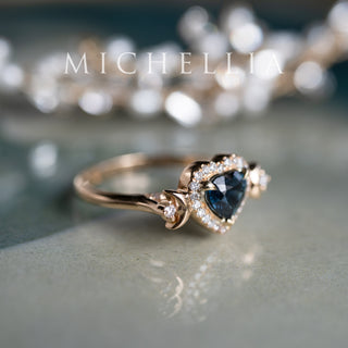 Main stone details: Natural Untreated Teal Sapphire, 0.9 carat Heart Cut, Eye Clean