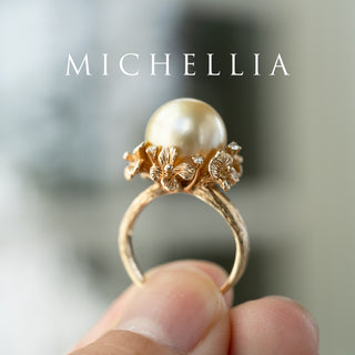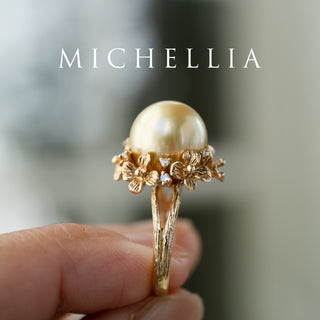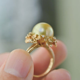 Bathed in the golden light of a summer meadow, our OOAK Elowen ring cradles a radiant 10mm South Sea pearl, with delicate, 3D-sculpted wildflowers around this precious gem. A few fairy-dusted diamonds sparkle gently around the pearl, like sunlight slipping through morning leaves, adding a touch of untamed enchantment to this sunlit treasure. It is a whispered reminder of the simpler days, filled with memories of open fields and endless skies, crafted to carry the light wherever you go.
