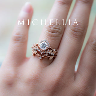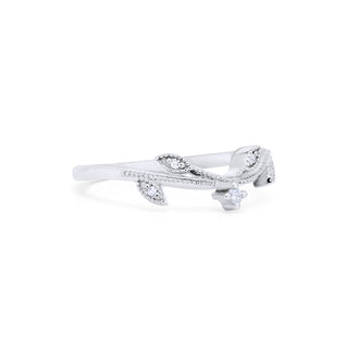 Our enchanting Hazel climbing vine leaf band is the latest addition to our Michellia Everbloom wedding band family. The slightly asymmetrical design brings a whimsical twist to our classic collection, while the sparkling natural diamond accents shine as brilliantly as always thanks to our unmatched stone quality control. Perfect for those who seek a blend of classic beauty and vintage charm, our beautiful Hazel band promises a unique symbol of love as captivating as your wildest woodland dreams.
