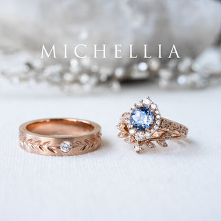 There’s something undeniably enchanting about tying the knot under a canopy of leaves, surrounded by the dense foliage of towering trees. We’ve been cast under the forest fairy’s spell, and you will be too with this delicately engraved leaf band with the unique gemstone of your choice.