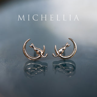 Mitsuki Limited Edition Cat and Crescent Moon Earrings, Solid Gold or Sterling Silver