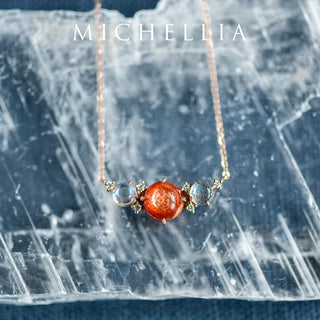 Featuring three of the most brilliant gemstones from the feldspar mineral family, our galaxy-inspired Celestine is a graceful love letter to someone who symbolizes the everlasting source of light and warmth in your universe. The tender sentiment is embodied in the form of a thoughtful interstellar arrangement with star-like diamonds, linking all of these astral bodies together into a wearable piece of love poetry.
