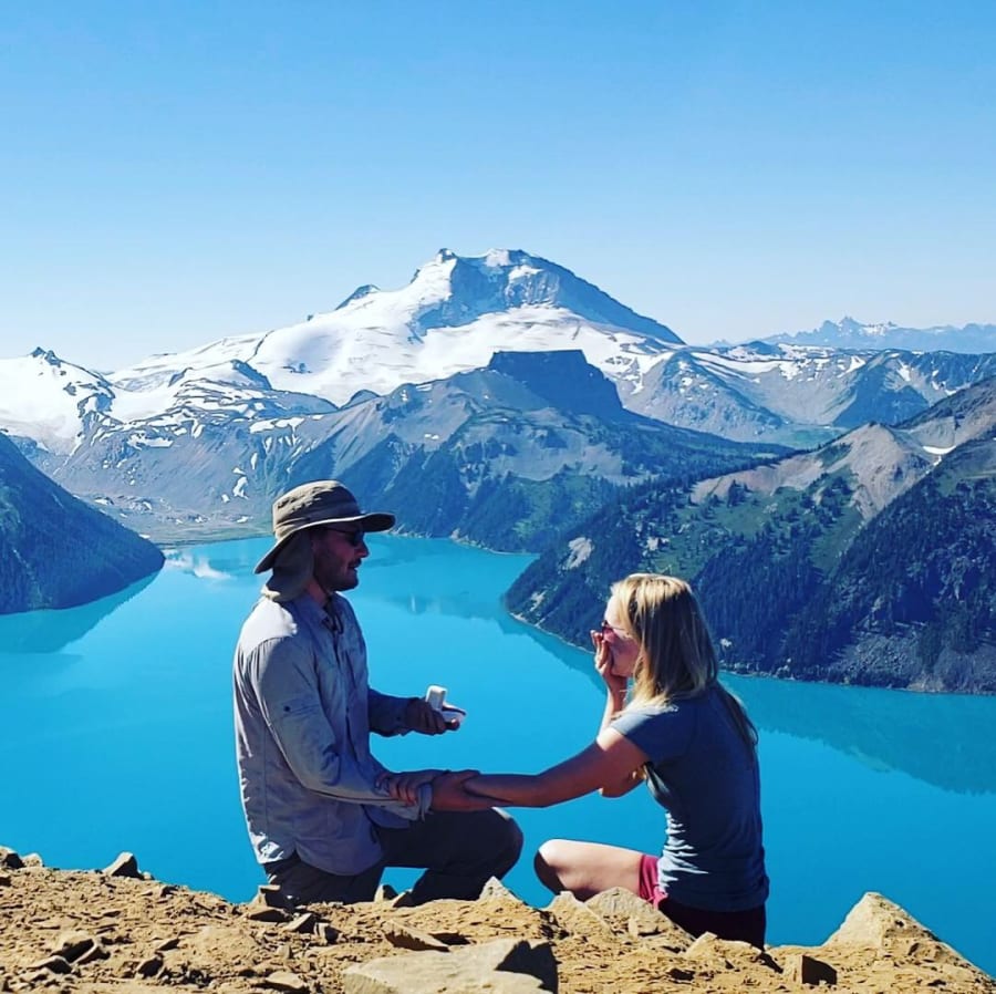 I am floored with my new engagement ring, and I want to share it with the world! After six and a half years, my best friend, my high school sweetheart, and my future husband asked me to marry him on top of Panorama Ridge in British Columbia, Canada overlooking the amazingly blue water of Garibaldi Lake. As I stared out at the Sphinx Glacier to the left and the snow capped mountain ranges to the right, I started thinking about all of the beautiful places I had ventured to with the only man I have ever loved. It was only fitting that my now fiance was setting up a camera behind us to film his proposal atop the most gorgeous mountain we had ever climbed together. As soon as I saw that shimmering, glittering floral ring in the little white box, the breathtaking view of Panorama Ridge was immediately overshadowed by the (literally) breathtaking image of the love of my life down on one knee. With tears streaming down my face, he told me how the most exciting adventure in his life is the one he partakes with me every day. Without the ability to utter a single word, I shook my head excitedly up and down as he asked me to be his wife. Thank you so much for the role you played in making this moment so special! We love the ring and cannot stop staring at it every time it sparkles on my little finger.