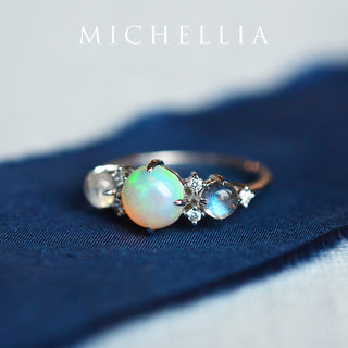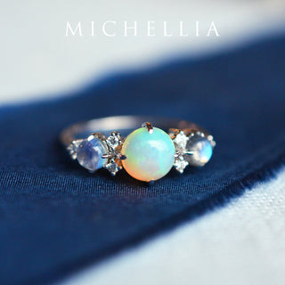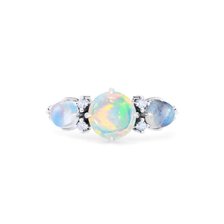Celestine Interstellar Three Stone Ring in Australian Opal, Moonstone, and Labradorite | R3004
